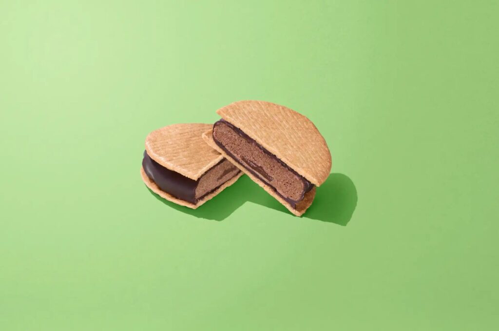【内容】中心にほんのりビターな味わいのチョコソースが入ったチョコクリームをパリっと食感のチョココーティングで覆い、サクっと食感のビスケット生地でサンドしました。