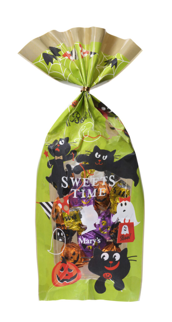 ⿊猫やカボチャ、おばけたちの楽しいデザインの袋にお菓⼦を詰め合わせました。