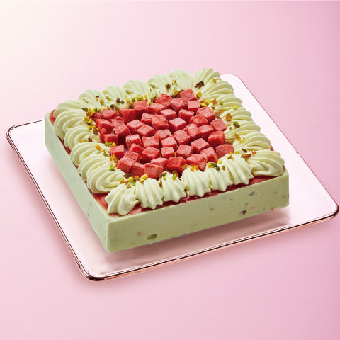 ピスタチオを混ぜ込んだアイスに、ベリーソース・いちごダイス・ピスタチオホイップで色鮮やかにデコレーションした、丸永製菓の「ベリーとピスタチオのアイスケーキ」。