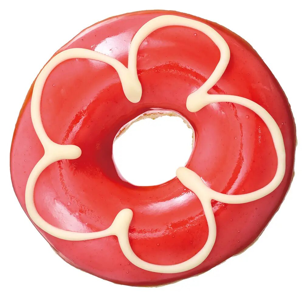『ストロベリー フラワー』は、赤い花をイメージしたドーナツ。ふわっと軽い生地の上にストロベリーコーティングをかけ、さらに甘酸っぱいストロベリーのナパージュで包み込みました。仕上げにミルキーなホワイトチョコで可愛らしいお花を描き華やかに仕上げた、いちごの味がじゅわっと口いっぱいに香るジューシーなドーナツです。